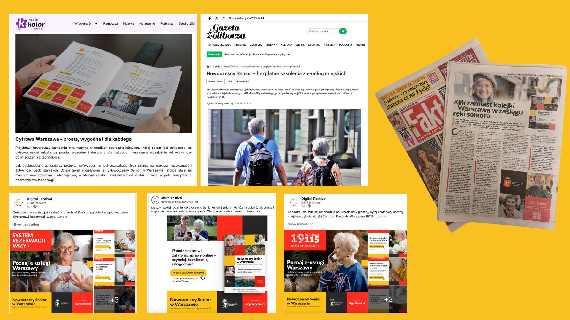 Zależało nam, aby każdy warszawski senior, a także ich bliscy, dowiedzieli się o możliwościach, jakie dają miejskie e-usługi oraz o przygotowanych dla nich bezpłatnych materiałach edukacyjnych i szkoleniach. Dlatego kampania była różnorodna i obecna tam, gdzie seniorzy szukają informacji na co dzień. Dzięki tym działaniom nasz projekt stał się widoczny dla warszawiaków, szczególnie trzech wybranych dzielnic: Bielan, Żoliborza i Mokotowa, a informacja o e-usługach miasta dotarła do tysięcy osób, które mogły skorzystać z broszury i szkoleń.